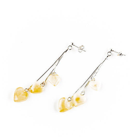 Øreringe (kæder) hver med tre hjerter lavet af naturlig nordisk rav, i farverne kærnemælk til elfenben
