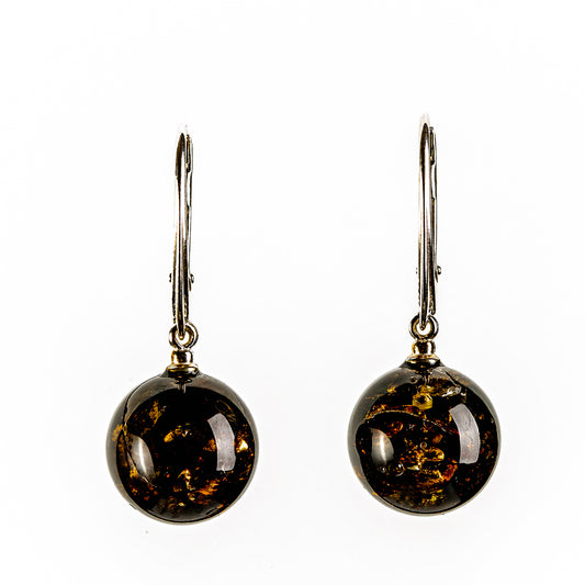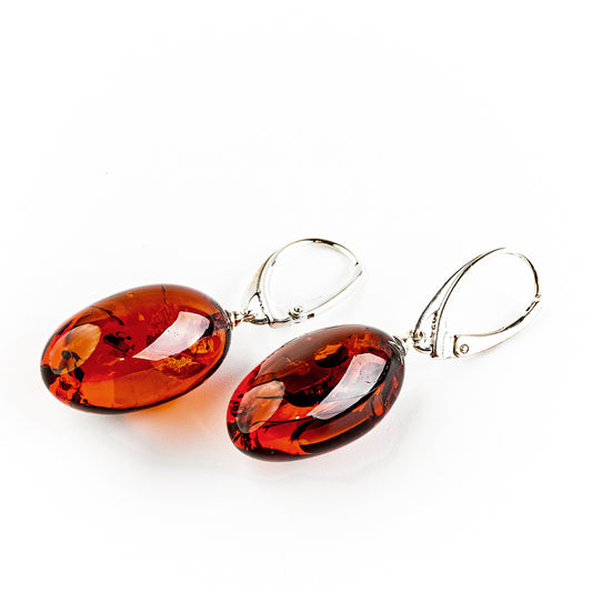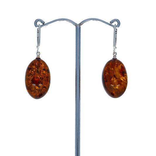 Oval amber earrings made of transparent amber beads with inclusions of bog flora